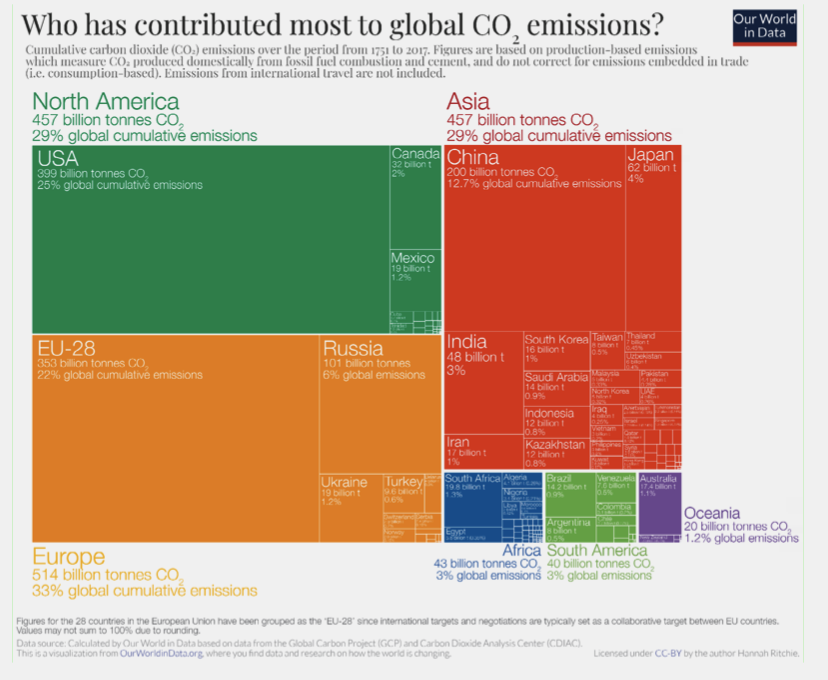 Лише Сполучені Штати внесли чверть загального обсягу викидів, тоді як третина надходить з Європи. З Африки ж надходить лише 3%. Не можна очікувати від країн, що розвиваються, що вони йтимуть на жертви, аби допомогти розвязати глобальні проблеми, спричинені переважно і ненавмисно розвиненими країнами. Тож необхідним елементом кліматичної справедливості має бути фінансування систем чистої енергетики за щедрої підтримки на пільгових умовах з боку тих країн, які найбільше відповідальні за кліматичну кризу.